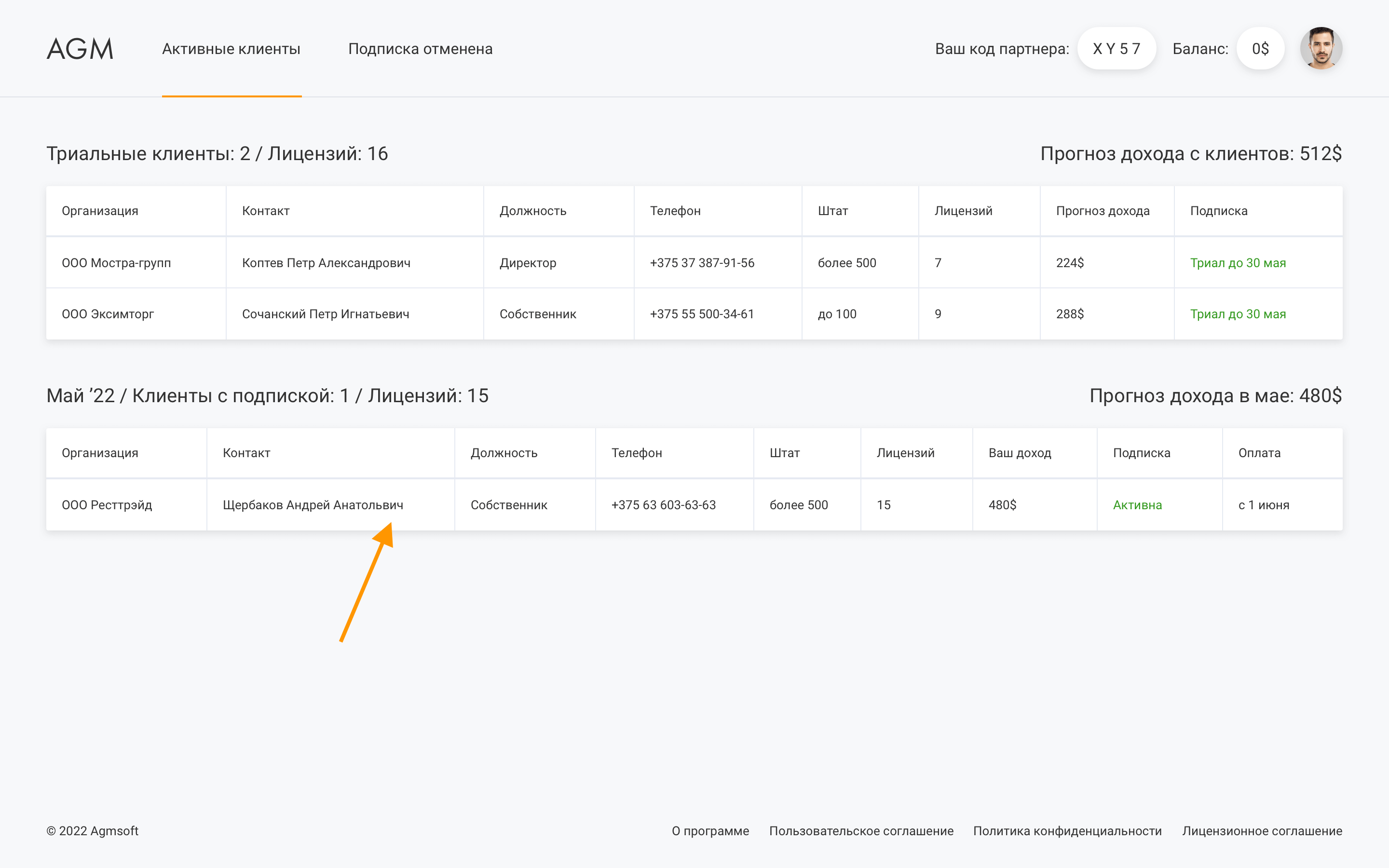 После завершения пробного периода, клиент попадает в таблицу текущего месяца как клиент с платной подпиской: